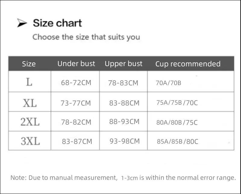 Note: Please choose the appropriate size based on your bust circumference and cup size, rather than using weight as the standard.Please do not choose the size arbitrarily to avoid size issues. Thank you.